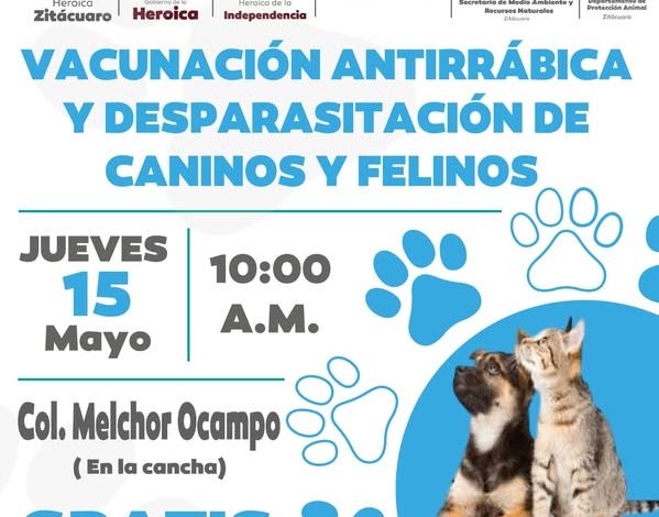 Zitácuaro, Mich., 14 de mayo de 2025.- El Gobierno de la Heroica, a través del Departamento de Protección Animal, informa que este jueves 15 de mayo, a las 10:00 a.m., se llevará a cabo una jornada gratuita de vacunación antirrábica y desparasitación de caninos y felinos en la colonia Melchor Ocampo (en la cancha).