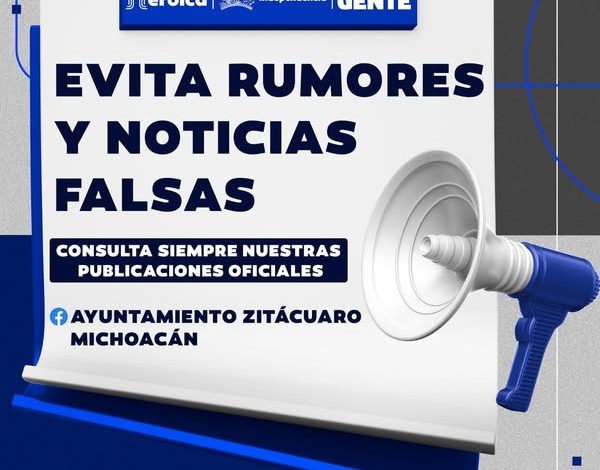 Zitácuaro, Mich., 19 de mayo de 2025.- El Gobierno de la Heroica Zitácuaro invita a la ciudadanía a mantenerse informada a través de sus redes oficiales, evitando difundir o dar crédito a rumores y noticias falsas que puedan generar desinformación.