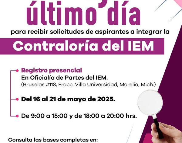 Morelia, Michoacán, 21 de mayo de 2025. El Instituto Electoral de Michoacán (IEM) recuerda que este miércoles es el último día para recibir solicitudes de aspirantes y participar en el concurso público abierto para ocupar la titularidad del Órgano Interno de Control del Instituto.