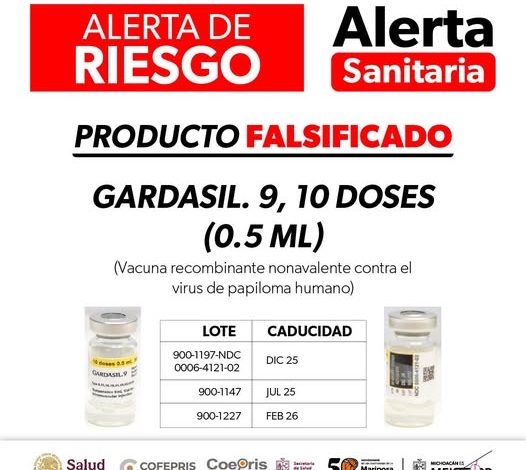 Morelia, Michoacán, 9 de junio de 2025.- La Comisión Federal para la Protección contra Riesgos Sanitarios (Cofepris) a través de la Secretaría de Salud de Michoacán (SSM), informa a la población y al personal de salud sobre la falsificación y comercialización ilegal de la vacuna GARDASIL® 9, suspensión intramuscular, en presentación de 10 dosis (0.5 mL), utilizada contra el virus del papiloma humano.