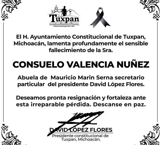 Tupan, Mich., 13 de junio de 2025.- El Gobierno de Tuxpan, se une a la pena que embarga al Lic. Mauricio Marín Serna, ante la irreparable pérdida de su abuela.