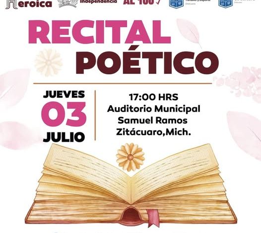 El Gobierno de la Heroica Zitácuaro te invita al Recital Poético, hoy jueves 3 de julio a las 17:00 horas, en el Auditorio Municipal Samuel Ramos.