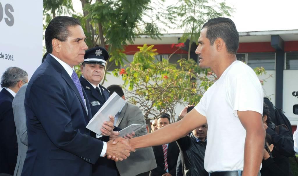 Morelia, Michoacán, a 10 de diciembre del 2015.- Al hacer entrega de reconocimientos e incentivos económicos a ex autodefensas que concluyeron el proceso de capacitación “Introducción al desarrollo de habilidades para la función policial”, el Gobernador del Estado, Silvano Aureoles Conejo, afirmó que, “en el Ejecutivo Estatal estamos avanzando con firmeza, para cumplir nuestra responsabilidad de garantizar la seguridad pública”.