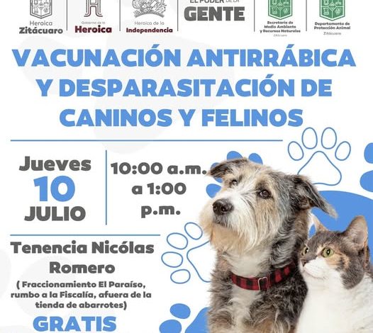 Zitácuaro, Mich., 8 de julio de 2025.- El Gobierno de la Heroica te invita a la jornada gratuita de vacunación antirrábica y desparasitación para caninos y felinos, este jueves 10 de julio, de 10:00 a.m. a 1:00 p.m., en la Tenencia Nicolás Romero (Fracc. El Paraíso, rumbo a la Fiscalía).