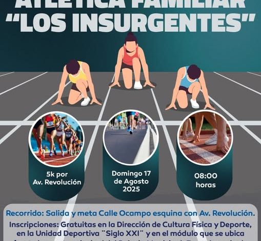 Zitácuaro, Mich., 13 de agosto de 2025.- El Gobierno Municipal de Zitácuaro te invita a participar en la Carrera Atlética Familiar “Los Insurgentes”, un evento para fomentar el deporte, la convivencia y el orgullo de nuestra #Heroica.