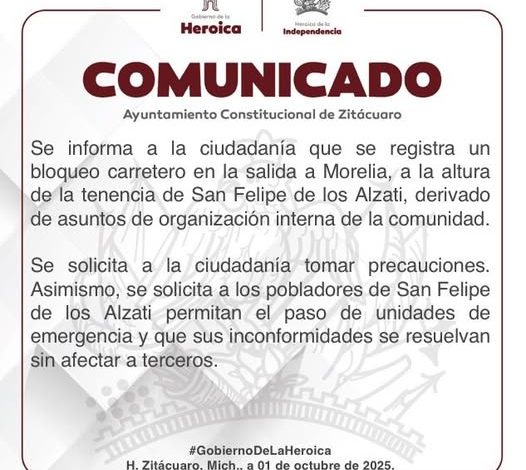 Zitácuaro, Mich., 1 de Octubre de 2025.- A través de un #ComunicadoOficial, el Gobierno de la Heroica informa sobre un cierre carretero a la altura de la Comunidad de San Felipe Los Alzati.