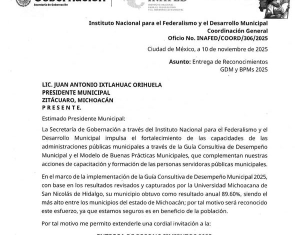 Zitácuaro, Michoacán, 11 de noviembre de 2025.- El Gobierno de la Heroica Zitácuaro, encabezado por el presidente municipal Juan Antonio Ixtláhuac, fue reconocido por la Secretaría de Gobernación del Gobierno de México a través del Instituto Nacional para el Federalismo y el Desarrollo Municipal (INAFED), por su destacada participación en la Guía Consultiva de Desempeño Municipal 2025 y el Modelo de Buenas Prácticas Municipales.