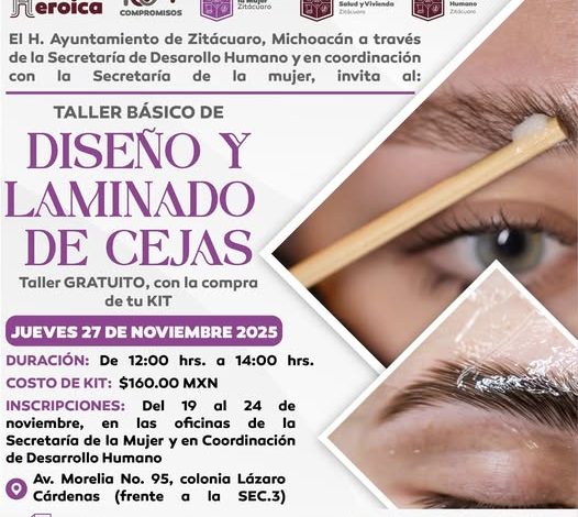 Zitácuaro, Mich., 24 de noviembre de 2025.- El Gobierno de la Heroica Zitácuaro, a través de la Secretaría de Desarrollo Humano y en coordinación con la Secretaría de la Mujer, invita al Taller Básico de Diseño y Laminado de Cejas.