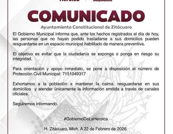 H. Zitácuaro Mich, 22 de febrero del 2026.- Gobierno de la Heroica pone a la orden de ciudadanos albergue.