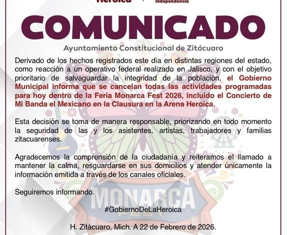 H. Zitácuaro Mich 22 febrero del 2026.- Cancela Gobierno de la Heroica todas las actividades para el día de hoy en el cierre del #MonarcaFest, invitando a la ciudadania a mantener la calma y no salir si no es necesario.
