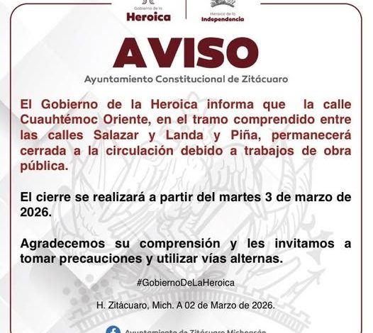 Zitácuaro, Mich., 2 de marzo de 2026.- El gobierno municipal de la heroica Zitácuaro anunció a través de un comunicado de prensa el cierre de la calle Cuauhtémoc Oriente, entre las calles de Salazar y Landa y Piña norte, debido a la construcción de obra vial en esta calle.