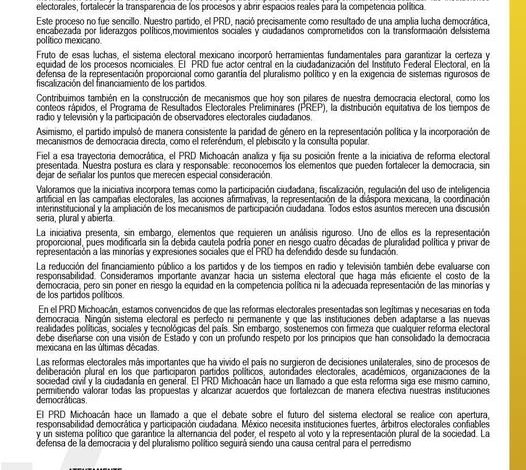 El PRD Michoacán reiteró que el proceso de discusión de la reforma electoral debe considerar la participación de instituciones electorales, especialistas, organizaciones civiles y ciudadanía, con el objetivo de que las modificaciones legales mantengan condiciones de competencia política, reglas claras para los procesos electorales y un sistema de representación que refleje la diversidad política del país.