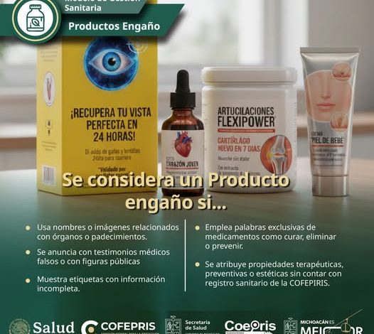 Morelia, Mich., 6 de abril de 2026.- La Secretaría de Salud de Michoacán (SSM), a través de la Comisión Estatal para la Protección contra Riesgos Sanitarios (Coepris), hace un llamado a la población para evitar el consumo y uso de los denominados “productos engaño”, los cuales representan un riesgo para la salud.