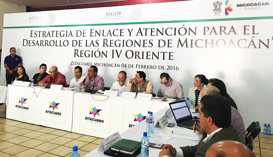 Zitacuaro, Michoacán a 4 de febrero del 2016.- Fue instalada la Estrategia de Enlace y Atención para el Desarrollo de las Regiones de Michoacán. El secretario de Gobierno, Adrián López Solís puso en marcha los trabajos de la Región IV Oriente, misma que sumará a dependencias estatales y federales para potencializar los trabajos en los municipios.