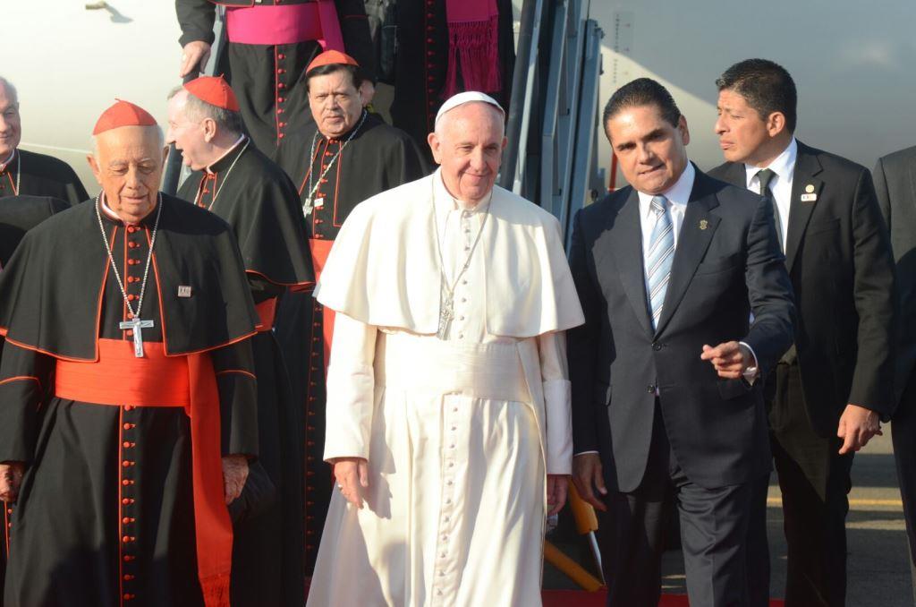 Acompañado por sus hijas, Sofía y Elizabeth Aureoles, y por el cardenal Alberto Suárez Inda, el mandatario estatal recibió al Papa Francisco al final de la escalinata del avión que tocó la tierra michoacana en punto de las 8:45 horas de este 16 de febrero, lo que provocó el júbilo y entusiasmo de los cientos de invitados que atestiguaron en el Aeropuerto Internacional de Morelia Francisco J. Múgica la tan esperada llegada del jerarca católico.