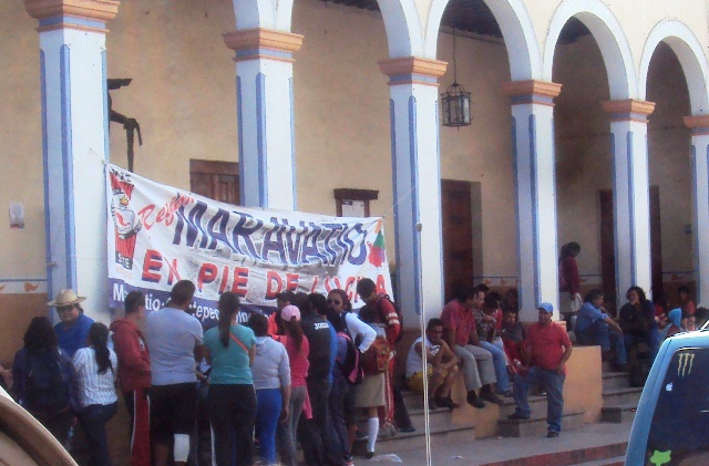 Maravatío, Mich.- Maestros Integrantes de la Coordinadora Nacional de Trabajadores de la Educación (CNTE), realizan la toma de la Presidencia Municipal de Maravatío, colocando una manta y perifoneo donde dieron a conocer el rechazo al Gobierno de Enrique Peña Nieto y sus reformas, así como en protesta a los estudiantes desaparecidos de Ayotzinapa;  y con esta son al menos 80 alcaldías tomadas en todo el estado.