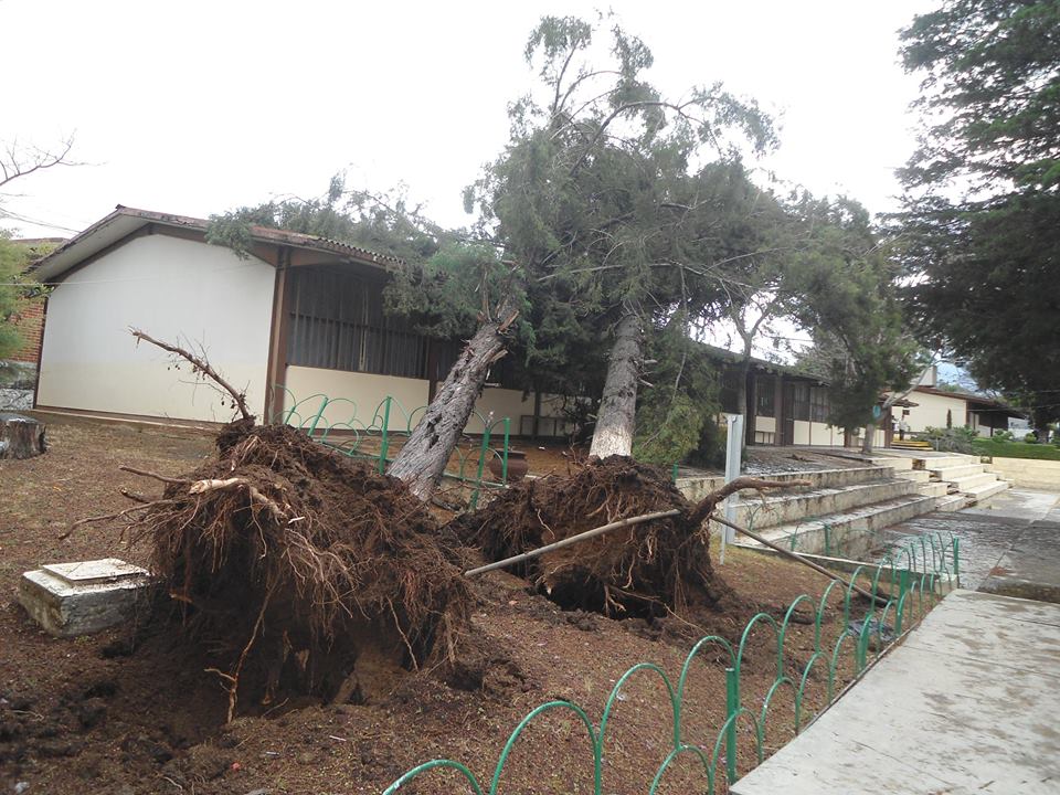 Por la tarde, alrededor de las 17 horas, cayó derribado el primer árbol, sin embargo fue hasta la madrugada de este día, cuando las rachas de viento arreciaron, que cayeron otros tres árboles, ocasionando afectaciones en algunos barandales del plantel, además de que las láminas que cubren los salones se destrozaron.