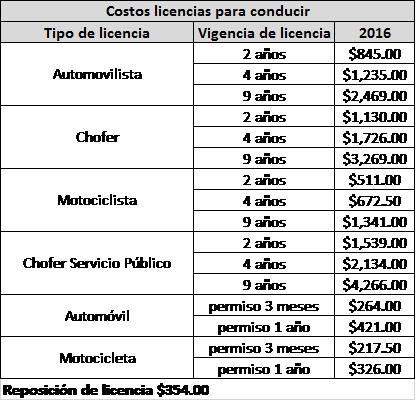 Los costos de las licencias para conducir oscilan entre los 217 pesosy los 4 mil 266 pesos; el precio varía dependiendo del tipo y de la vigencia de la misma, siendo el periodo de vigencia más corto de dos años, y el más largo de nueve años.