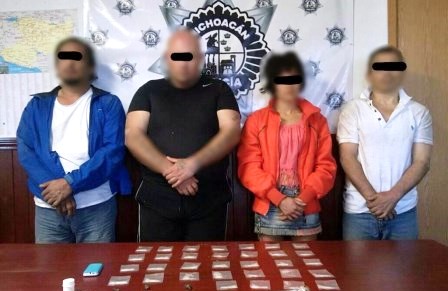 En el municipio de Paracho, agentes policiales le marcaron el alto a cuatro tripulantes que iban a bordo de un vehículo marca Nissan, tipo Sentra, del servicio público, para efectuarles una inspección de rutina a Fernando V., Juana A., Roberto H., y Pedro Z., a quienes les decomisaron 39 envoltorios de plástico con sustancia granulada con las características de la droga conocida como Cristal, 40 pastillas color rosa y una pipa de vidrio.
